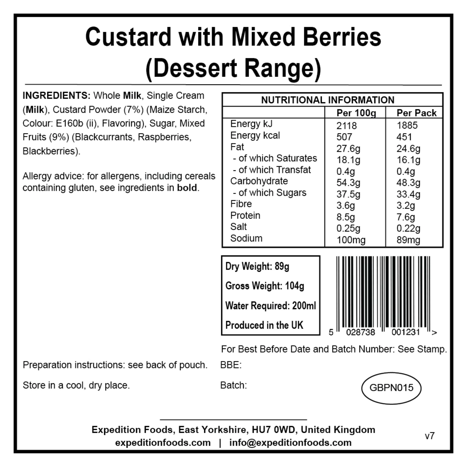 The Expedition Foods Custard and Mixed berries is a delicious, nutritionally balanced, dried food product for high intensity, multi-day activities.