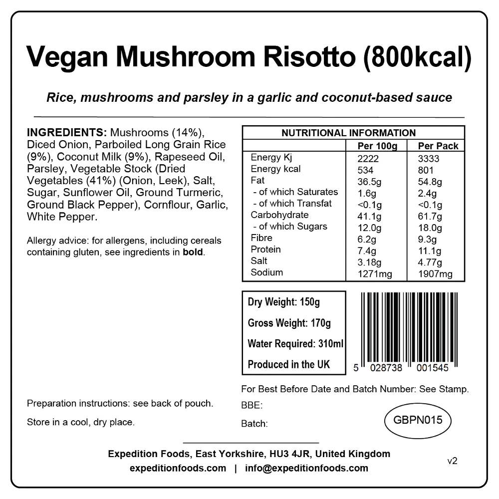 The Expedition Foods Vegan Mushroom Risotto (800kcal) is a delicious, nutritionally balanced, dried food product for high intensity, multi-day activities.