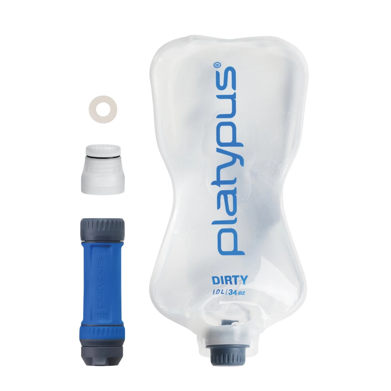 The ultralight Platypus QuickDraw 1L Filter System delivers fast and easy filtration and allows users to customize their systems with multi-vessel compatibility, to give adventurers the best user experience of any squeeze filter on the market. The 1L dirty reservoir is light and compact and built to withstand the rugged demands of a months-long thru-hike. Its wide-mouth opening and fill-handle keep your hands dry while you quickly and easily fill up so you can keep moving. On the filter, the dirty-side I/O (inner/outer) threads attach to the QuickDraw reservoir as well as common narrow-mouth bottles like smartwater® and other Platy bottles. On the clean side, select between the DrinkCap for drinking and pouring and the ConnectCap™ that attaches to narrow-mouth bottles. The system is built to be safe, effortless and long-lasting. Two cleaning methods—shake-to-clean and backflushing—keep the filter flowing fast throughout your trip, while the Integrity Check process allows you to ensure it’s still safely filtering water. With its incredible ease-of-use, packability, and fast-flowing performance, the QuickDraw 1L Filter System is the best squeeze filter for your backpacking trips.