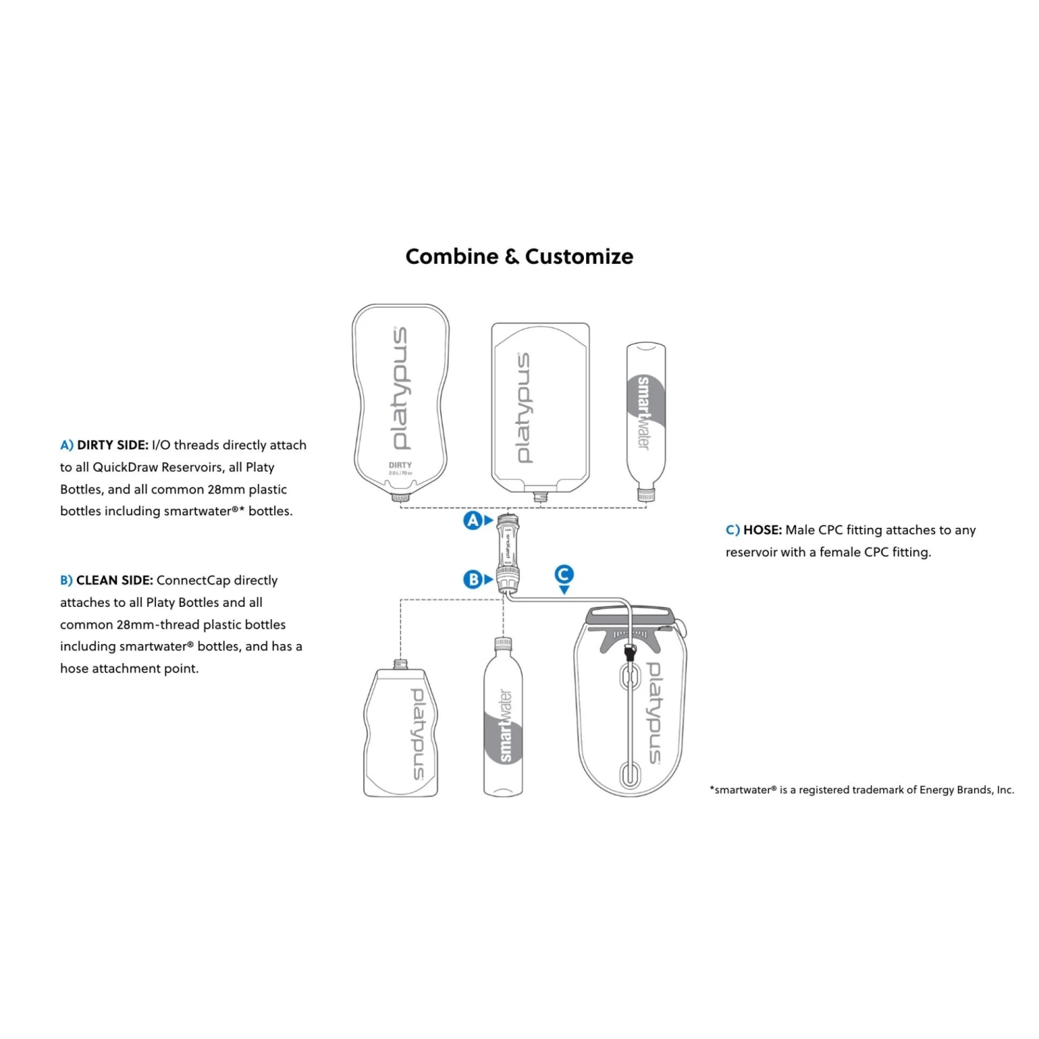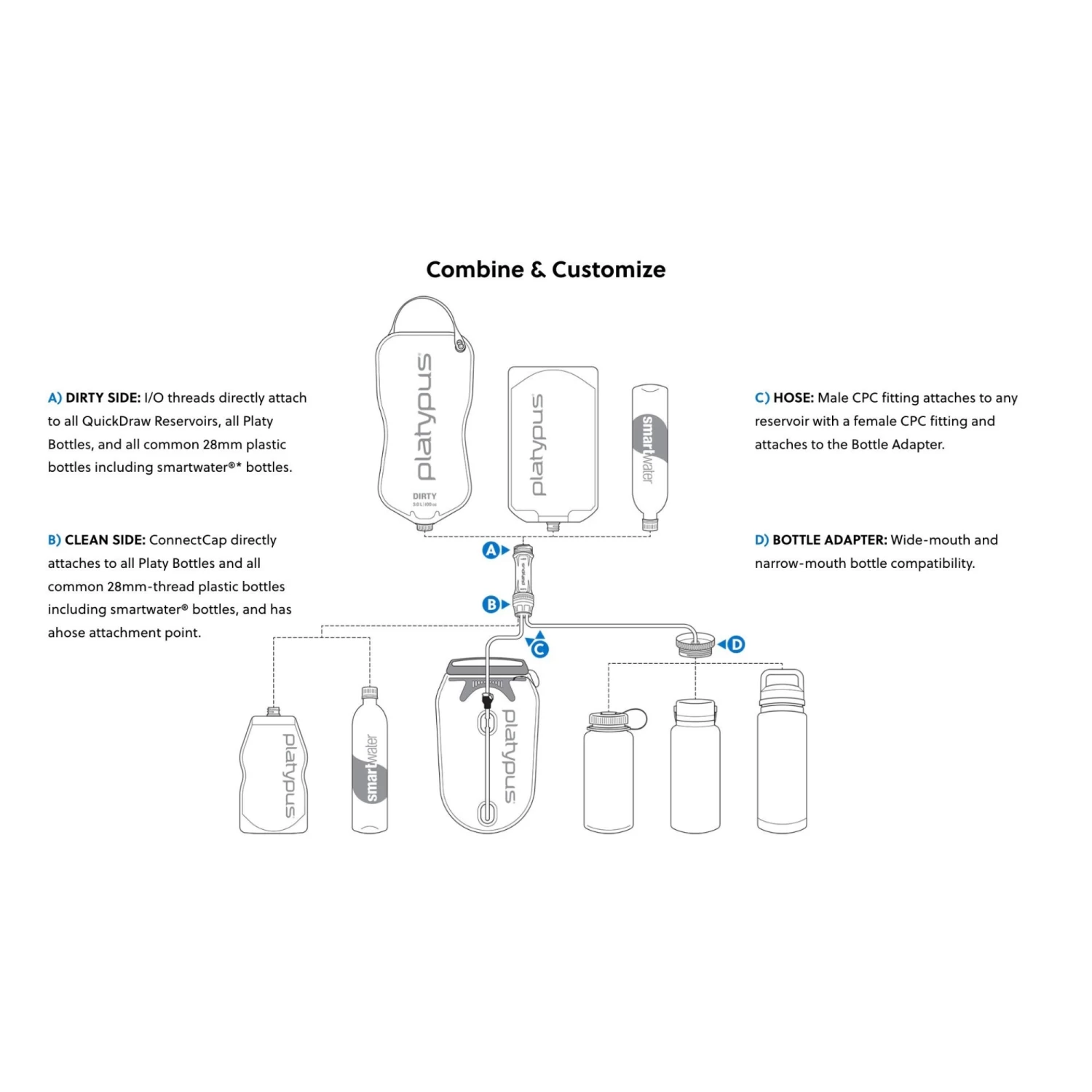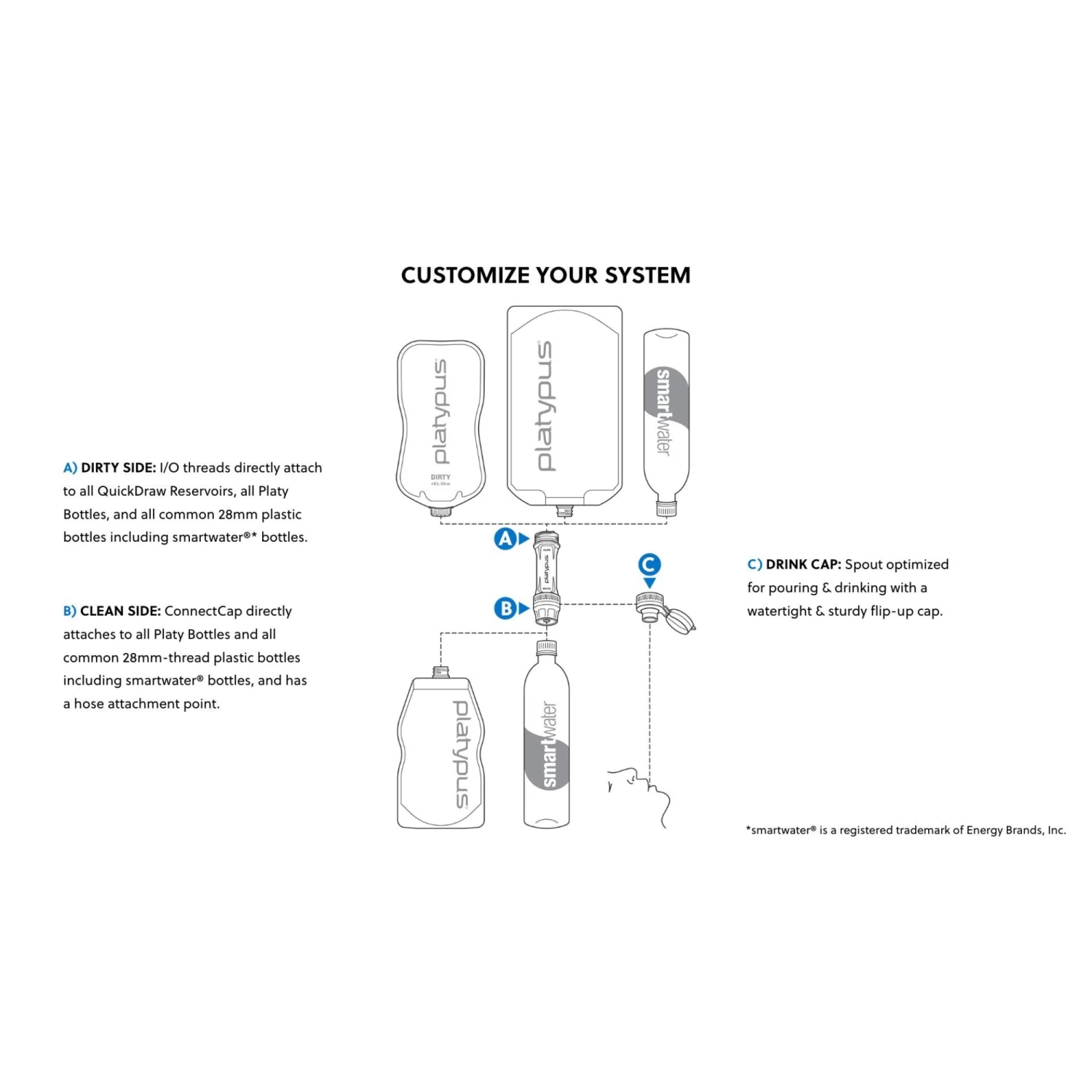 The Quickdraw ‘Build Your Own System’ features an Inside/Outside dual thread design, which means that the filter attaches to smartwater® bottles, the Platypus Hoser Reservoir, Platypus 2.0L Bottle, Platypus SoftBottle™, Platypus Water Tank and various common 28mm plastic drinks/water bottles.