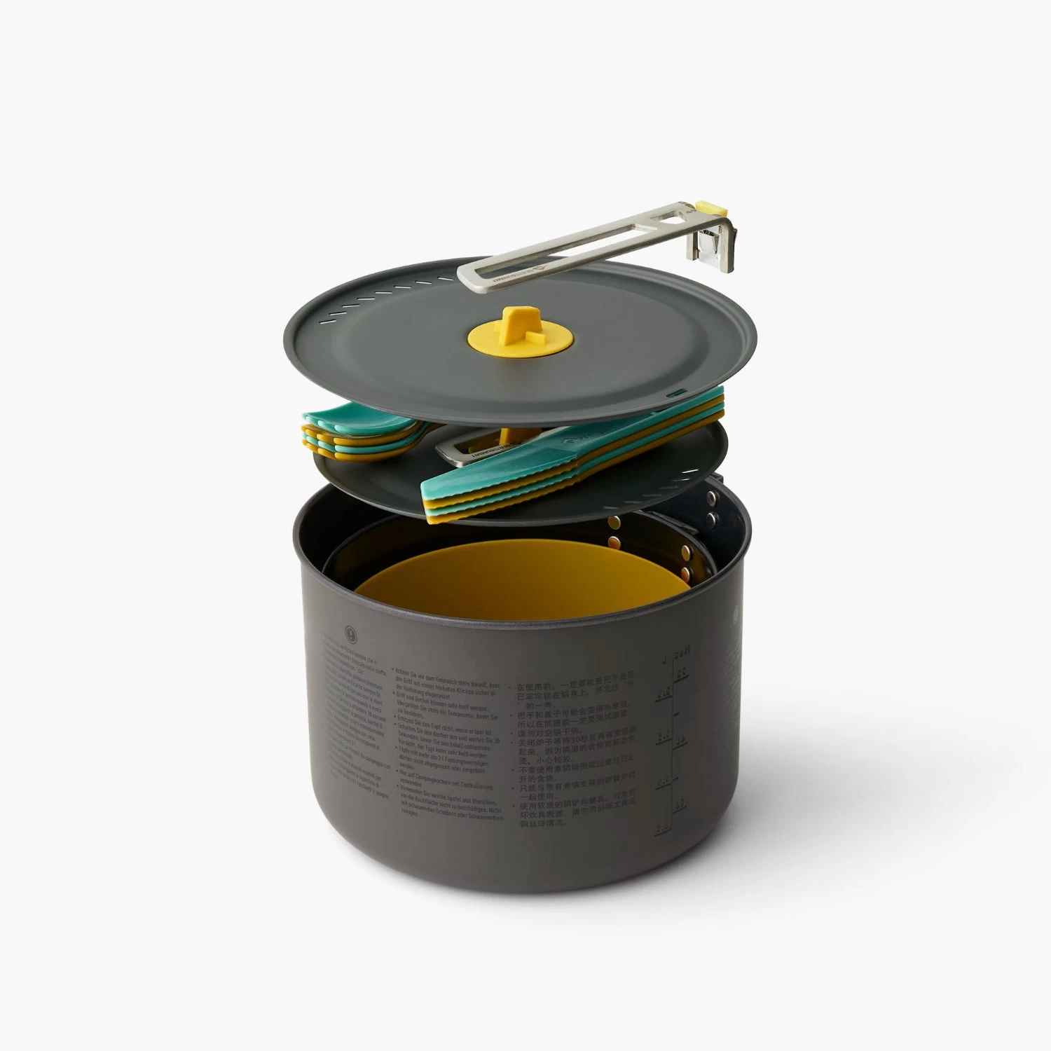 Experience the ultimate culinary potential with the Sea to Summit 4-Person Frontier Ultralight Two-Pot, 14-Piece Cook Set. This luxurious set includes two hard-anodised alloy pots, four medium bowls, and stylish knives and sporks, perfect for any outdoor adventure. The pots are equipped with an abrasion-resistant ceramic coating and a convenient removable handle, making meal preparation a breeze. Enjoy the ultimate camping kitchen experience with this durable and versatile set. Suitable for Camping, Backpacking, Mountaineering, Bike Touring, Overland.