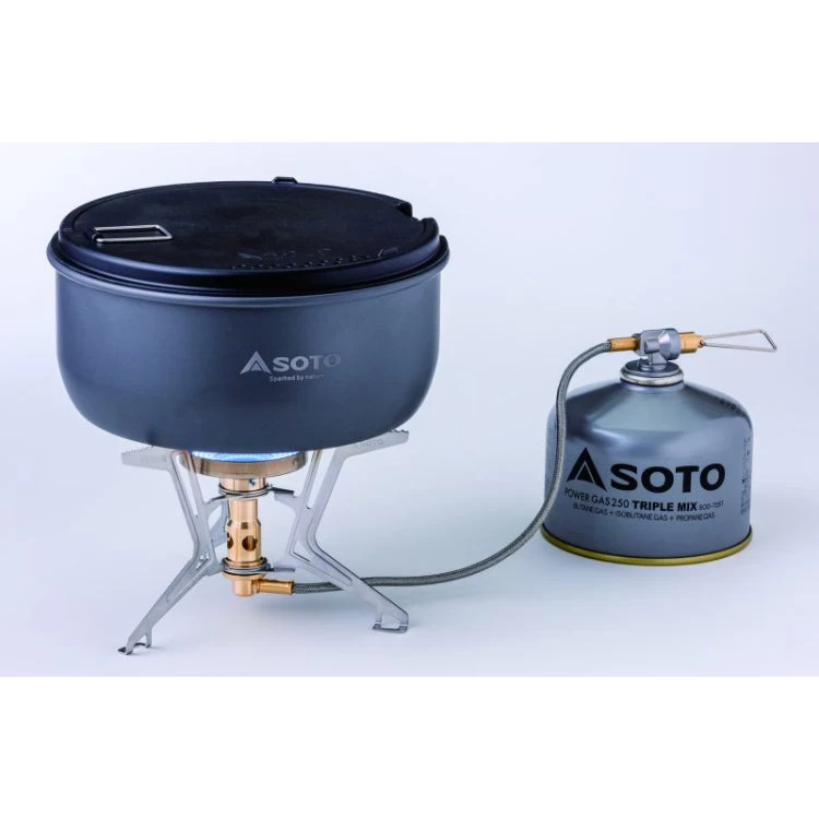 - Micro Regulator: A stove’s output is reduced under lower ambient temperatures due to cooling of the gas canister when in use. This is an inherent weakness in gas stoves. SOTO’s Micro Regulator provides a consistent flame, in cold weather and when used continually.